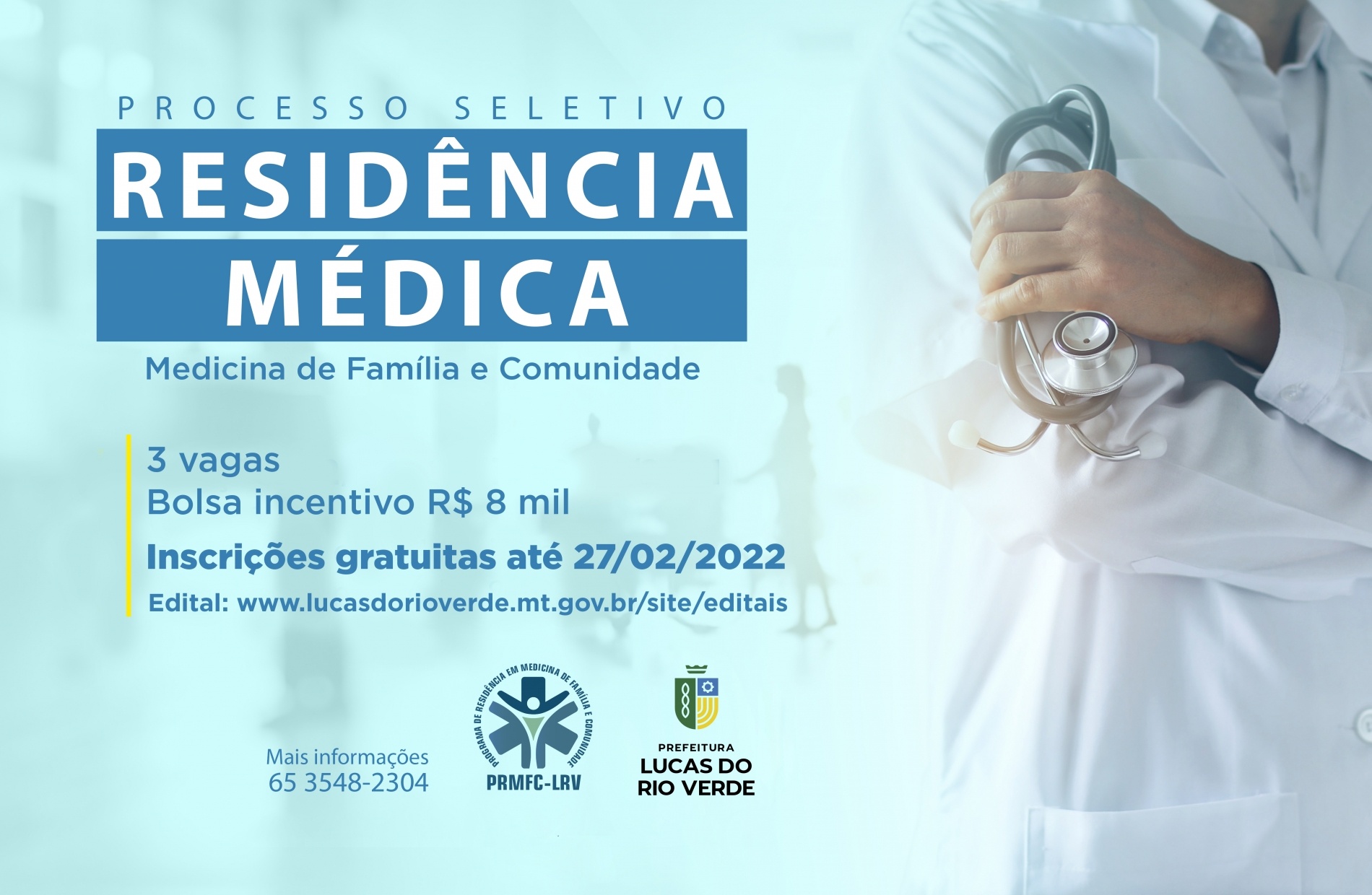 A Prefeitura de Lucas do Rio Verde informa que está ofertando seis vagas para o Programa de Residência Médica em Medicina de Família e Comunidade. As inscrições são gratuitas e devem ser feitas até dia 27 de fevereiro.