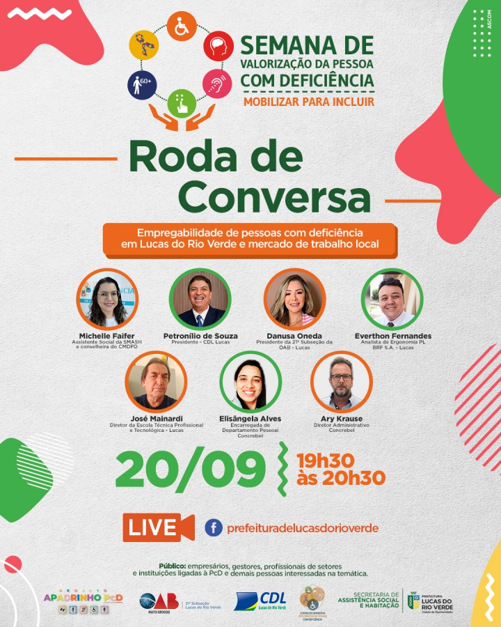 Live com o tema: “Empregabilidade de Pessoas com Deficiência em Lucas do Rio Verde e mercado de trabalho local” – transmissão pelo Facebook da Prefeitura: www.facebook.com/prefeituradelucasdorioverde