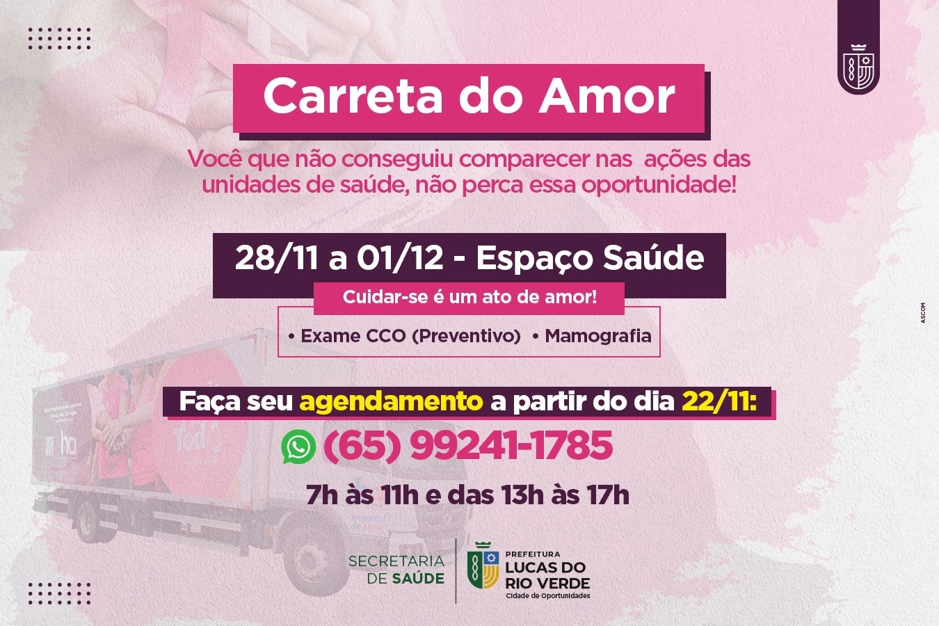 Lucas do Rio Verde recebe na próxima semana a Carreta do Amor. Serão realizados os exames de mamografia e preventivo de colo de útero. A ação é uma parceria entre a Prefeitura de Lucas do Rio Verde, Hospital de Amor e Consórcio Público de Saúde Vale do Teles Pires.