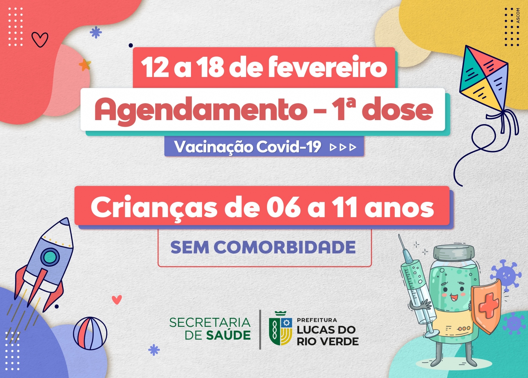 A Secretaria de Saúde de Lucas do Rio Verde informa que está aberto o agendamento para imunização contra a Covid-19 em crianças de 6 e 11 anos com e sem comorbidades pelo período de 12 a 18 de fevereiro.