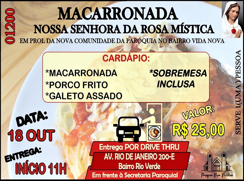 No próximo domingo (18) acontecerá a Macarronada da Paróquia da Nossa Senhora da Rosa Mística, que este ano por conta da Pandemia da Covid-19, acontecerá no sistema ‘Drive Thru’, onde aquelas que pessoas que adquirirem ao valor de R$ 25,00 (cada macarronada), poderá à partir das 11h, buscar sua macarrona não precisando sair do carro.
