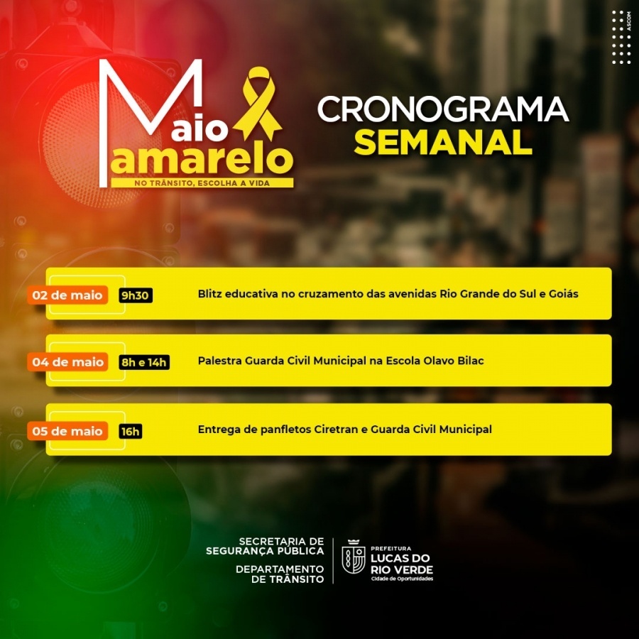Em Lucas do Rio Verde, nesta semana, a abertura da programação será com uma blitz educativa no cruzamento das avenidas Rio Grande do Sul e Goiás, nesta terça-feira (2). Na quinta-feira (4), a Guarda Civil Municipal realizará palestra de conscientização na Escola Municipal Olavo Bilac, às 8h e 14h. Outras unidades também terão ação até o fim do mês.