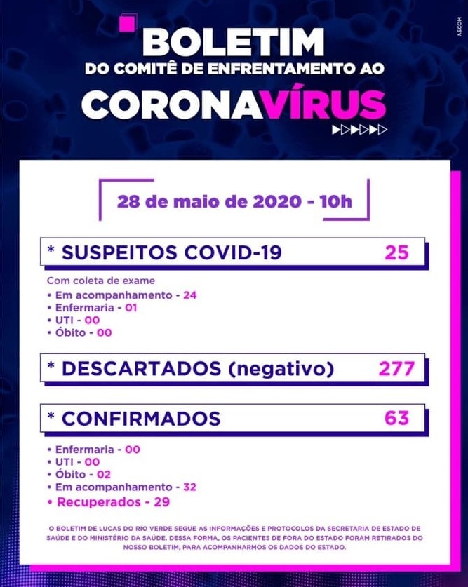 Por outro lado, o boletim ressalta que o total agora é de 277 pessoas que estão no grupo de descartados, sejam por exames do Lacen-MT (Laboratório Central de Mato Grosso), por vínculo a esses casos agora negativos ou por exames realizados em laboratórios da rede privada e que estão habilitados pela Secretaria de Estado de Saúde.