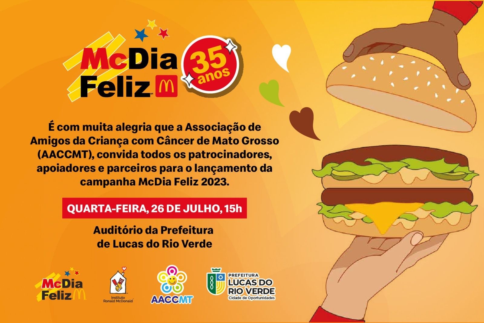 A AACC-MT – Associação de Amigos das Crianças com Câncer de Mato Grosso é uma das instituições beneficiadas pelo McDia Feliz 2023 e iniciou, no dia 26/07/2023 aqui em Lucas do Rio Verde/MT, a venda antecipada dos tíquetes da 35ª edição da campanha, uma das maiores ações de mobilização em prol da saúde e educação de crianças e jovens do Brasil. Em 2023, o McDia Feliz vai acontecer no dia 26 de agosto (sábado), com a venda antecipada dos tíquetes do Big Mac já disponíveis no valor de R$ 18,00 na Instituição AACCMT.
