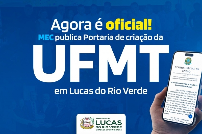 Na manhã desta quarta-feira (26), o Ministério da Educação (MEC) e a Secretaria de Regulação e Supervisão da Educação Superior (Seres) publicaram a Portaria nº 865 que oficializa a criação do Campus Fora de Sede da Universidade Federal de Mato Grosso (UFMT) em Lucas do Rio Verde. O ato simboliza a concretização de um sonho da sociedade luverdense e da gestão municipal, que trabalhou de forma contínua para viabilizar a implantação do centro de formação, pesquisa, tecnologia e inovação no município.