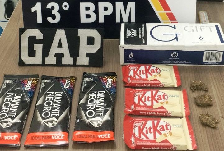Os policiais realizaram a abordagem e na busca pessoal foram encontradas 3 porções de substâncias análoga à maconha, 6 barras de chocolate e 11 maços de cigarro.