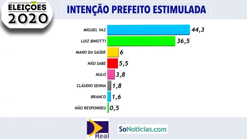 O empresário Miguel Vaz tem 44,3% das intenções de votos para prefeito de Lucas do Rio Verde, aponta a pesquisa Real Dados/Só Notícias. O atual prefeito, Luiz Binotti, candidato à reeleição, aparece com 36,5%, Mano da Saúde tem 6% e Claudio Sena 1,8% na modalidade estimulada. Não sabem 5,5%, nulos 3,8%, branco 1,6% e não respondeu 0,5%. A margem de erro é de 5% para mais ou para menos.