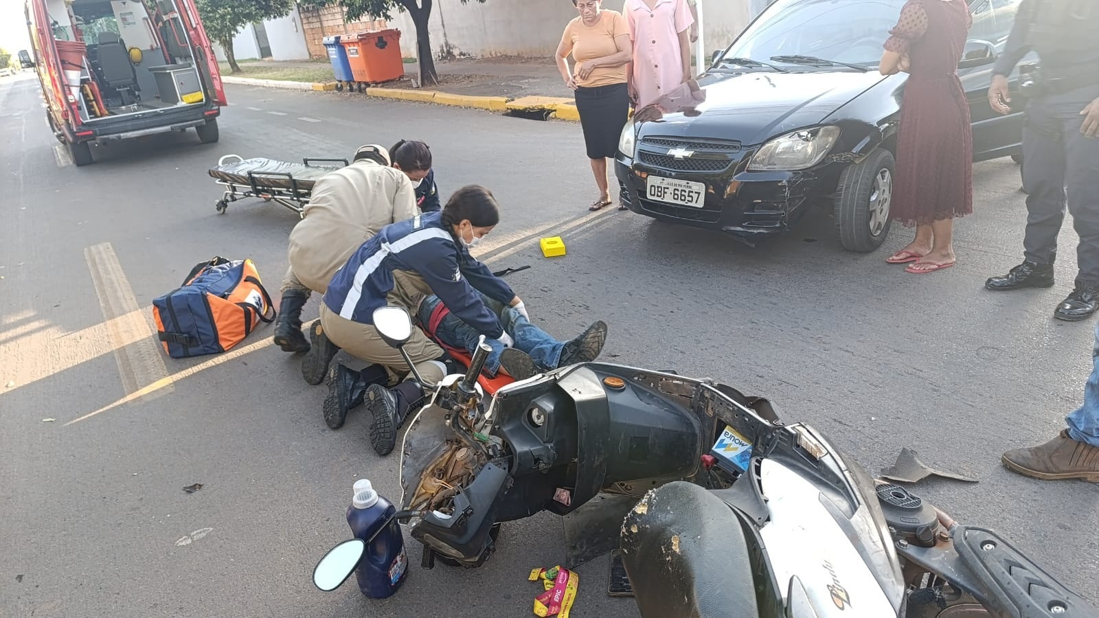 Ele sofreu escoriações pelo corpo e foi socorrido pelo Corpo de Bombeiros, sendo encaminhado ao Pronto Atendimento Municipal para cuidados médicos. A motorista do carro não se feriu. Ambos os veículos sofreram danos, sendo que a motocicleta teve avarias de média monta.