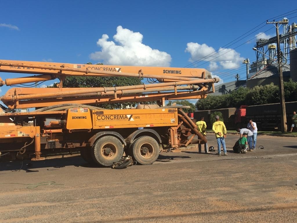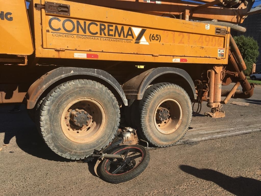 Informações levantadas no local dão conta que o caminhão munk de uma empresa realizava a rotatória, quando um motociclista não teria parado na esquina, acertando o tanque do veículo e rolando por baixo do caminhão.
