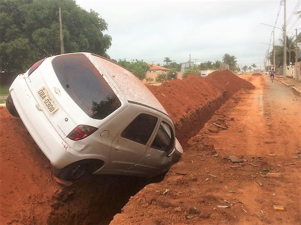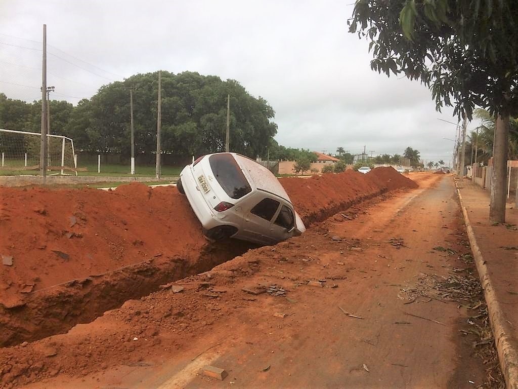 Na madrugada de hoje (08), por volta das 4h, o motorista de um Chevrolet Celta, de cor branca, acabou perdendo o controle do veículo e entrou em uma vala que está aberta na Avenida das Nações no Bairro Menino Deus, por conta de obras de esgoto que acontecem no local.