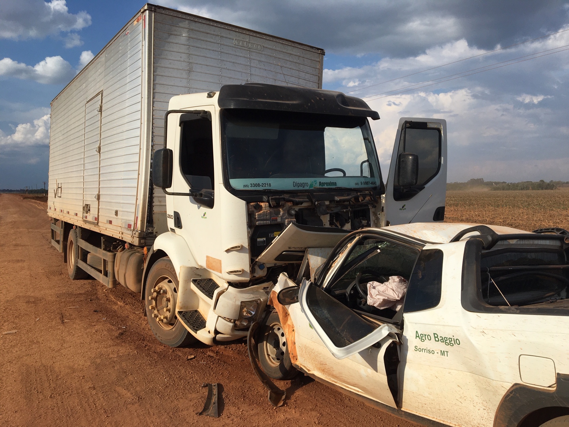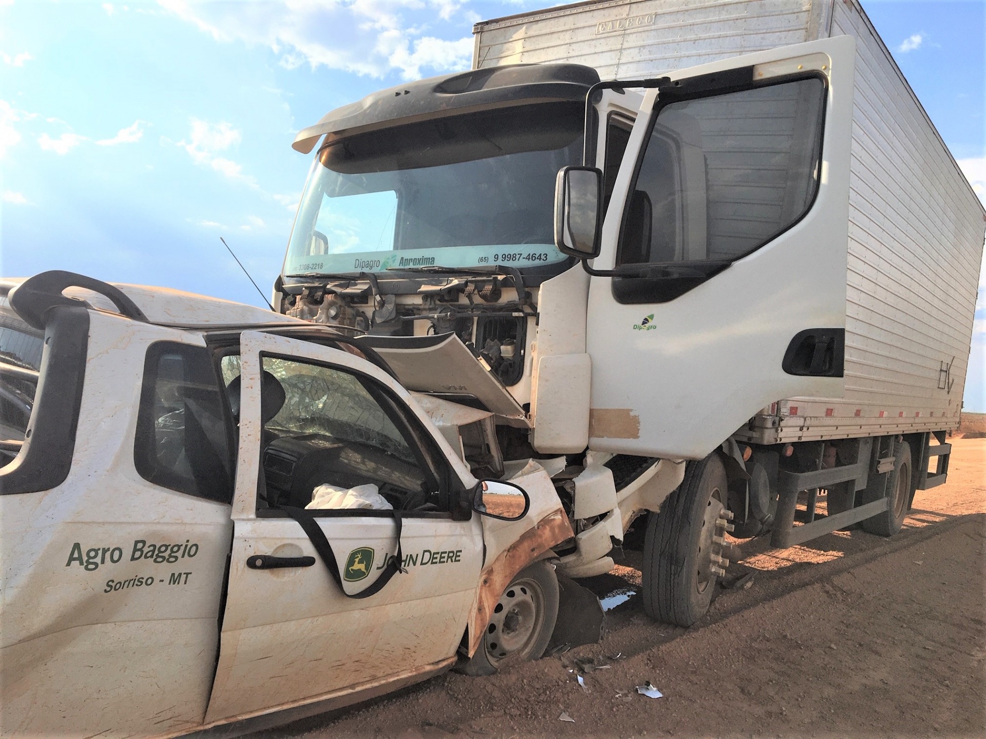 Na tarde desta quarta-feira (28), na estrada que dá acesso à Linha Morocó já no município de Sorriso, mas próximo a Lucas do Rio Verde, houve uma colisão frontal entre um caminhão Volvo baú e uma pick up Fiat Strada, ambos os veículos de empresas.