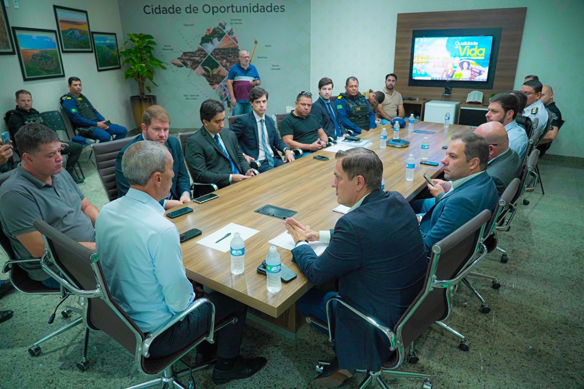 Os trabalhos para fortalecer a segurança pública em Lucas do Rio Verde não param. Nesta quinta-feira (7), o prefeito Miguel Vaz recebeu, em seu gabinete, o secretário estadual de Segurança Pública (Sesp-MT), Coronel Roveri. Além dele, participaram representantes das Sistema Penitenciário, forças de segurança municipais, Polícias Civil e Militar, Judiciário, Ministério Público, Defensoria Pública e Corpo de Bombeiros. Durante o encontro, foram debatidas melhorias para o sistema prisional, aumento de efetivo, câmeras de monitoramento, vinda de novas viaturas, entre outras.