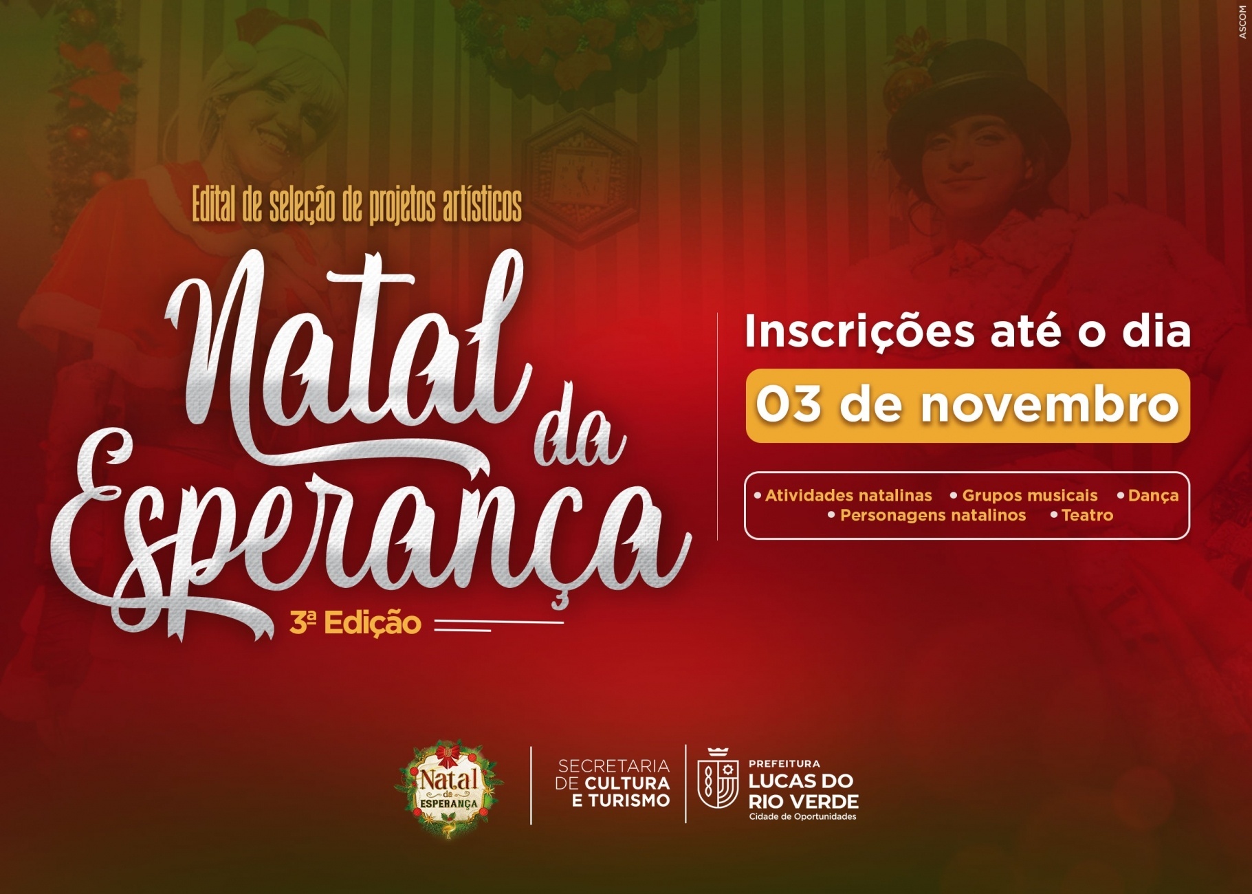 A Prefeitura de Lucas do Rio Verde, por meio da Secretaria de Cultura e Turismo, abriu nesta sexta-feira (18), as inscrições para o edital “Natal da Esperança – 3ª Edição”. O objetivo é selecionar projetos culturais de artistas luverdenses para fazer parte da programação do Natal.