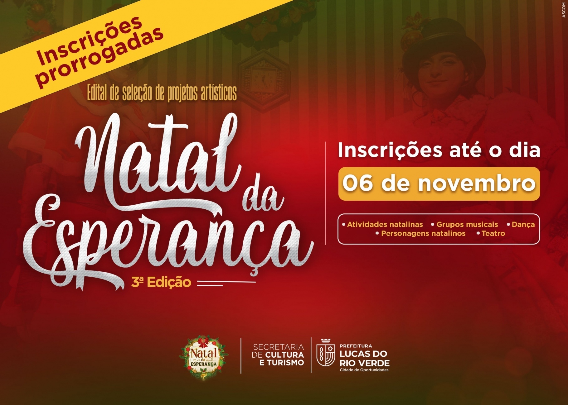 A Secretaria de Cultura e Turismo de Lucas do Rio Verde prorrogou as inscrições do edital “Natal da Esperança – 3ª Edição”. Os interessados em participar da seleção dos projetos artísticos têm até segunda-feira (06), para apresentar a ficha de inscrição e toda a documentação necessária na sede da Secretaria de Cultura e Turismo, que fica localizada na Avenida São Paulo, nº 363 E, bairro Cidade Nova.