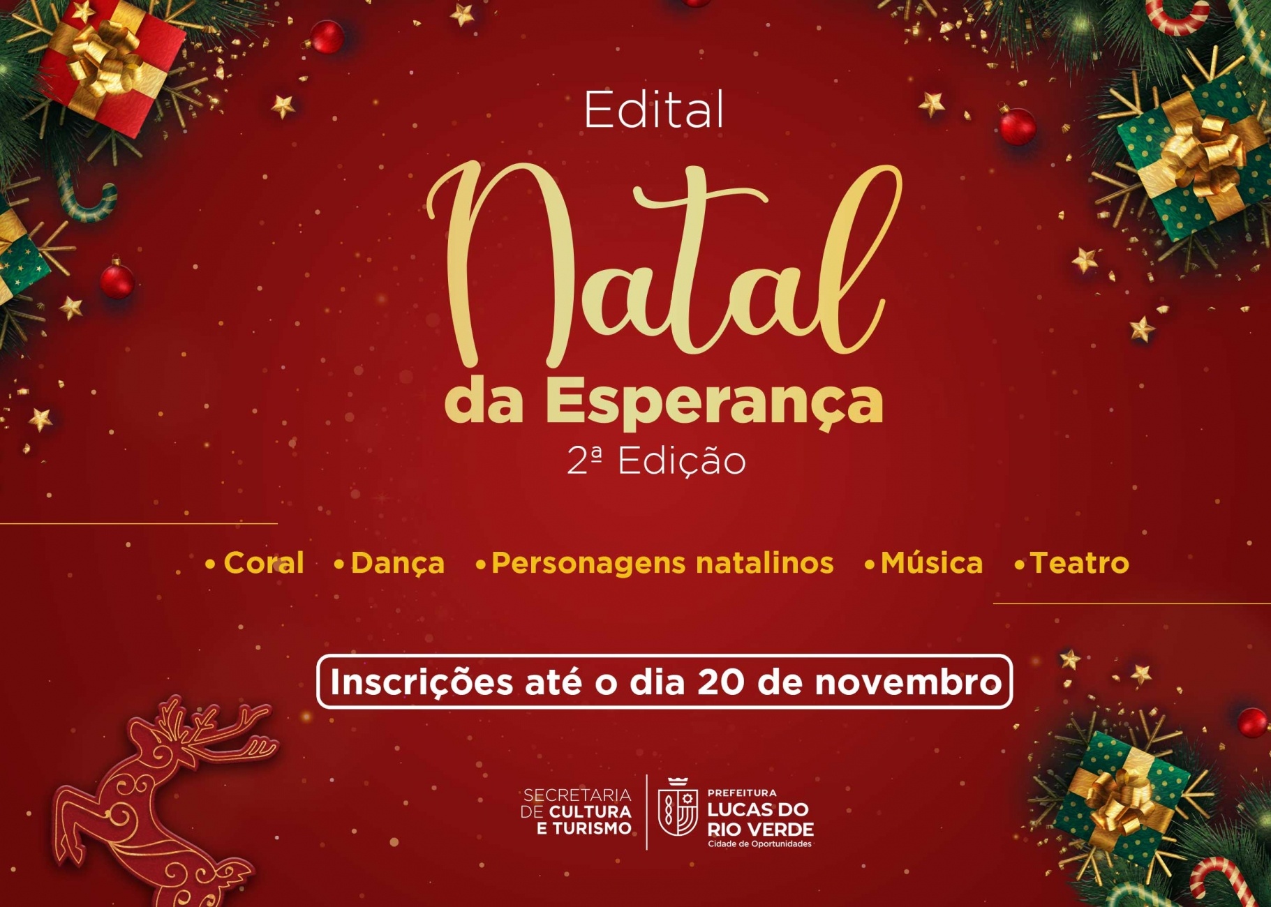 Com o objetivo de selecionar produções culturais de artistas luverdenses para fazer parte da programação do Natal, a Prefeitura de Lucas do Rio Verde, por meio da Secretaria Municipal de Cultura e Turismo, está com inscrições abertas para o edital “Natal da Esperança – 2ª Edição”.