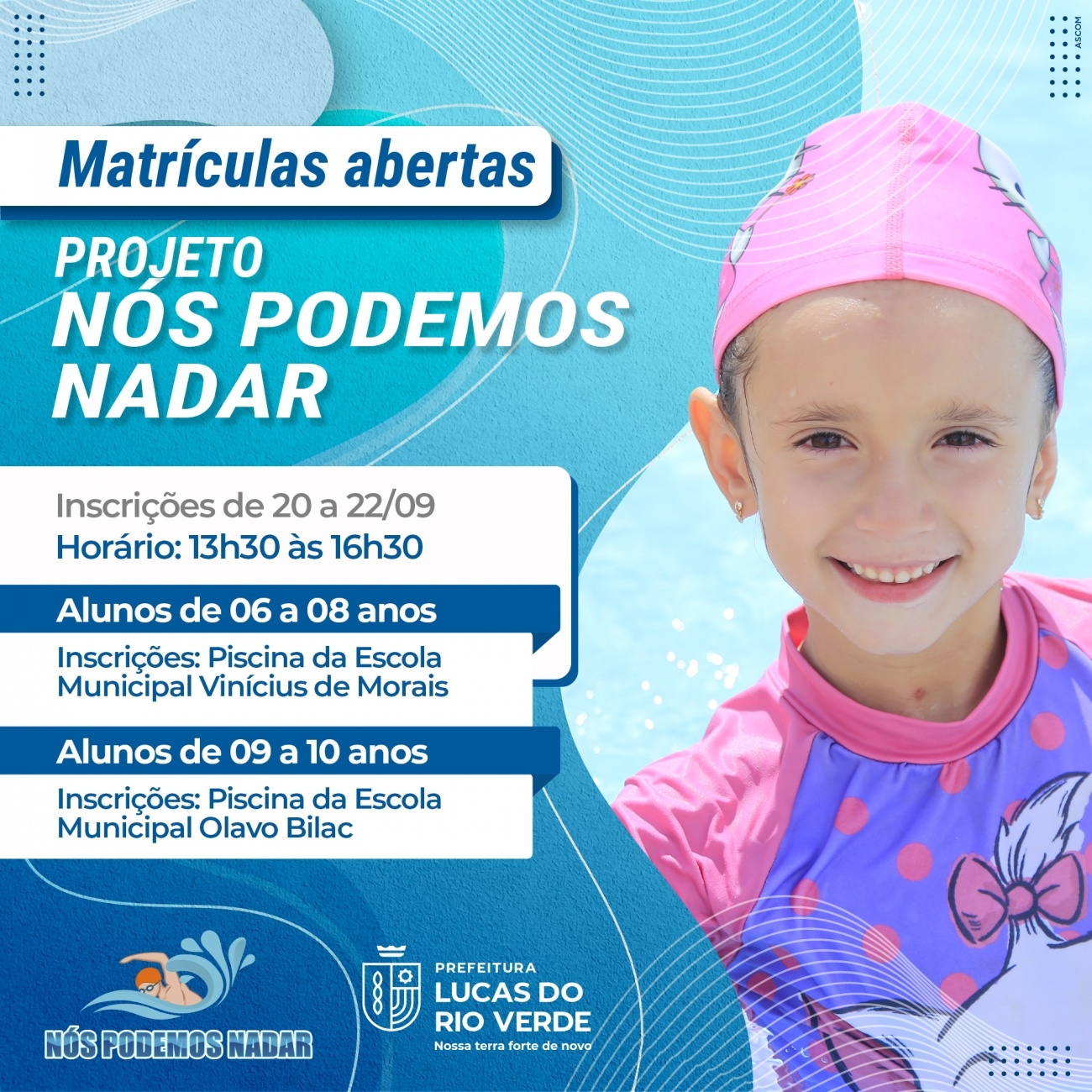 O Projeto Nós Podemos Nadar abre matrículas, a partir de segunda-feira (20) até quarta-feira (22), aos alunos de todas as redes de ensino (pública e privada) para aulas de natação. Podem se inscrever crianças com idade entre 06 a 08 anos na piscina da Escola Municipal Vinícius de Moraes e de 09 a 10 anos, na piscina da Escola Municipal Olavo Bilac.