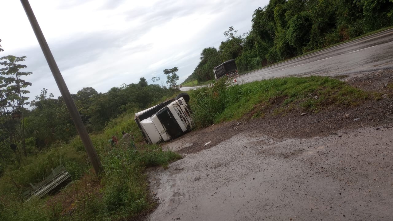 Pista escorregadia causa tombamento de carreta na BR-163