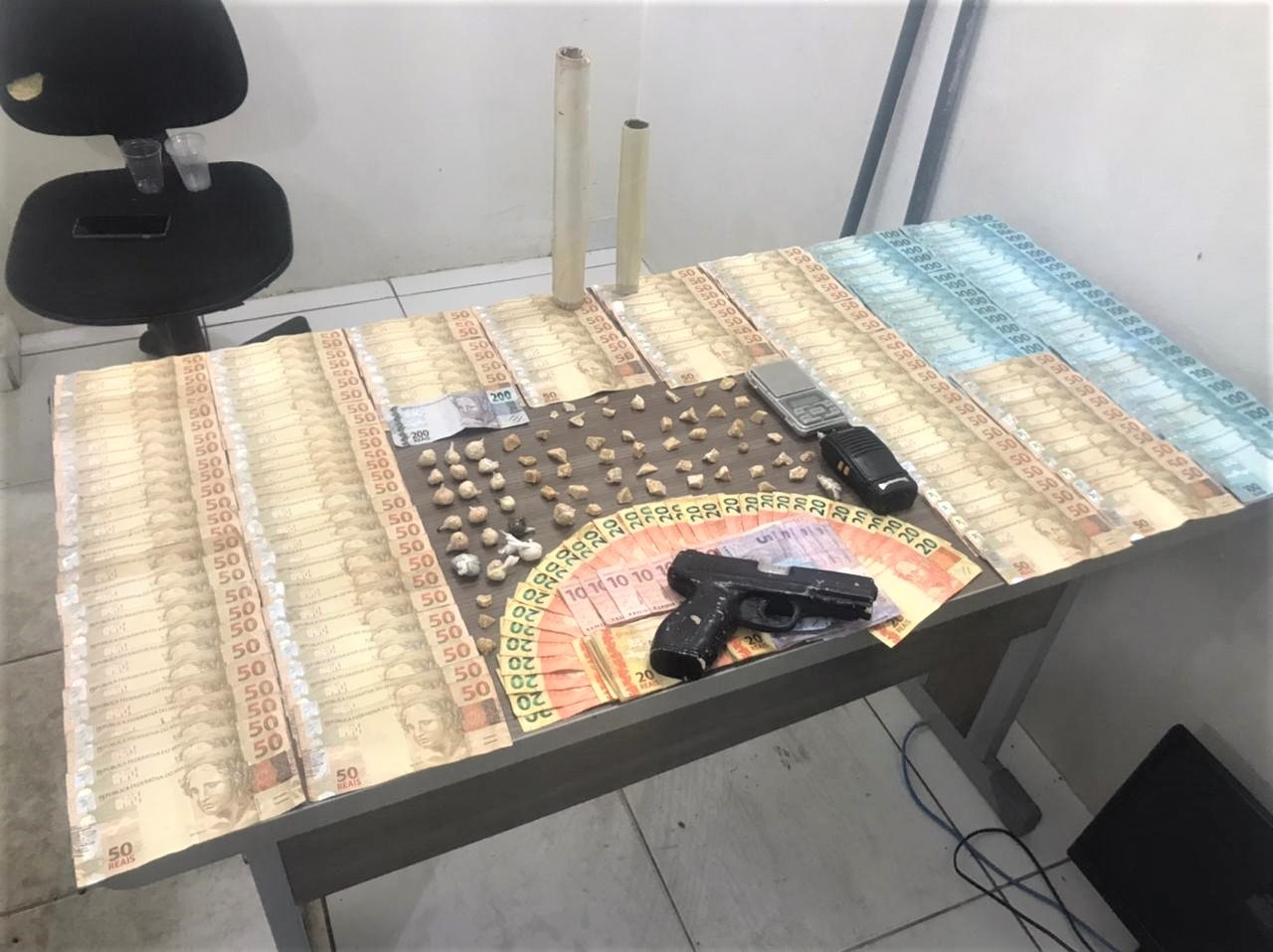 Em buscas na residência, foram encontrados R$ 9,500,00 em dinheiro, 01 rádio comunicador, 01 simulacro de arma de fogo, 01 balança de precisão e um invólucro grande contendo 22 porções de pasta base de cocaína.