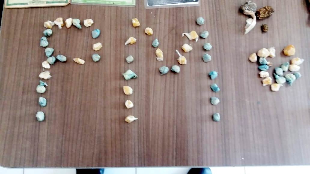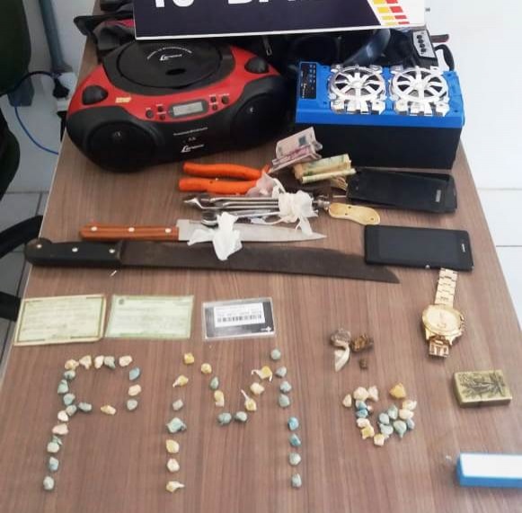 Dentro da residência estavam mais oito pessoas incluindo uma mulher. Foram feitas buscas pela residência e encontrado 58 pedrinhas de pasta base análoga a cocaína e um pequeno pedaço de maconha, e alguns objetos que podem ser produto de roubo/furto.