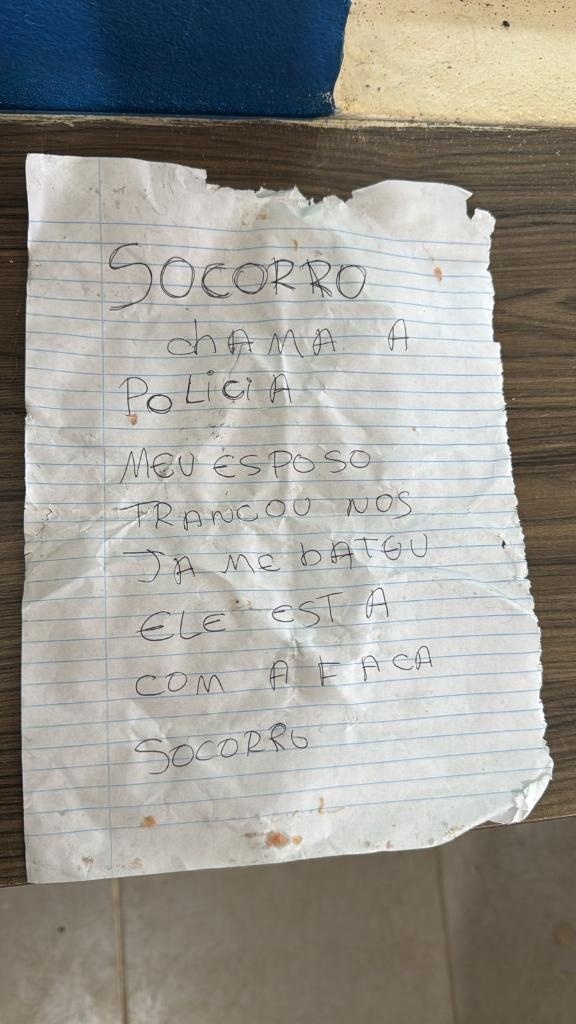 Os policiais militares foram acionados para atenderem a uma ocorrência de possível sequestro em uma residência no bairro Vida Nova II. No local, os militares encontraram um bilhete com a seguinte mensagem: "Socorro, chama a polícia. Meu esposo nos trancou e já me bateu. Ele está com uma faca. Socorro".