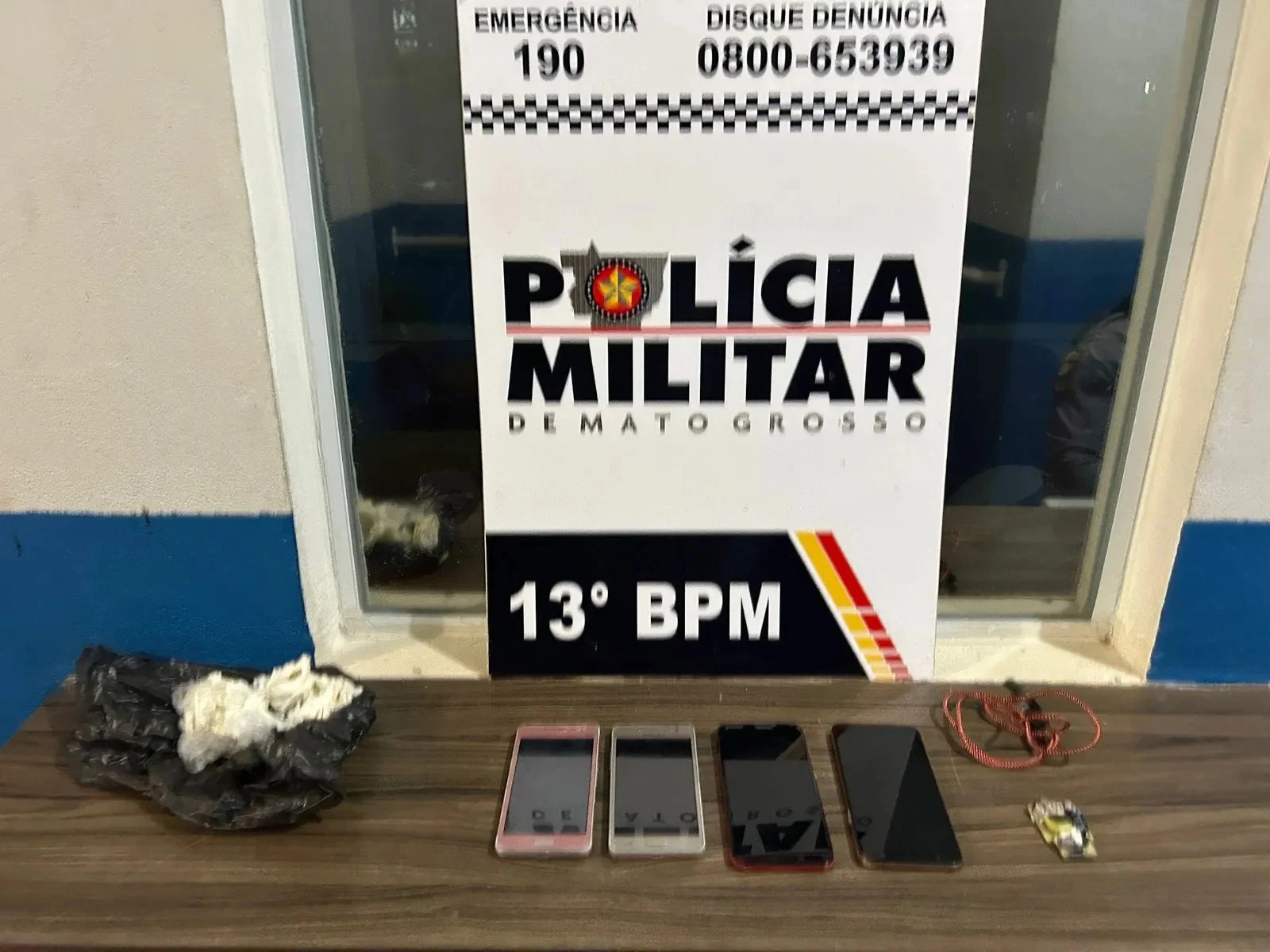 Além dos aparelhos celulares embalados com esparadrapo, dois chips desbloqueados, um inibidor de sinal de rastreamento e um cabo que aparentava ser utilizado para carregar os dispositivos.