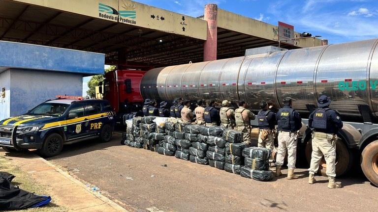 No início da tarde de ontem, por volta do meio-dia, a PRF apreendeu quase 900 Kg de entorpecentes no município de Nova Mutum. A equipe responsável pela ação deu ordem de parada a uma carreta Scania vermelha acoplada a um semi reboque tanque, identificado com a inscrição "óleo vegetal".