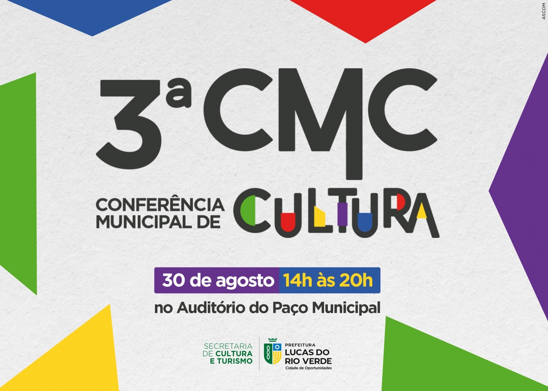 A Secretaria de Cultura e Turismo de Lucas do Rio Verde convida a população para participar da 3ª Conferência Municipal de Cultura. O evento é gratuito, aberto também para os produtores culturais da região e será realizado no dia 30 de agosto, das 14h às 20h, no Auditório dos Pioneiros, no Paço Municipal.