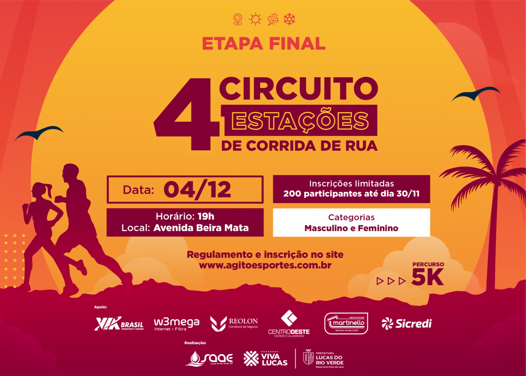 Já estão abertas as inscrições para a última etapa do Circuito Quatro Estações de Corrida de Rua de Lucas do Rio Verde. A prova será realizada no dia 04 de dezembro, na Avenida Beira Mata, em frente ao Parque de Exposições Roberto Munaretto. O percurso será de 5 km, com início das provas marcado para 19h.