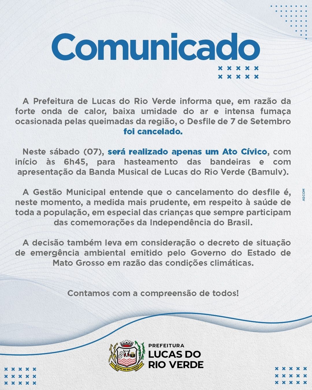 A Prefeitura de Lucas do Rio Verde informa que, em razão da forte onda de calor, baixa umidade do ar e intensa fumaça ocasionada pelas queimadas da região, o Desfile de 7 de Setembro foi cancelado.