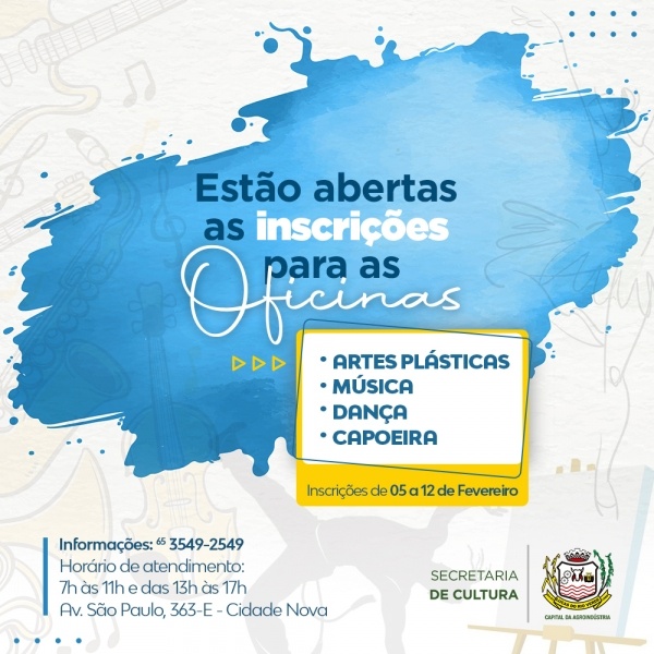 As matrículas devem ser feitas de 05 a 12 de fevereiro, de segunda a sexta-feira, das 7h às 11h e das 13h às 17h, na Secretaria de Cultura, na Av. São Paulo, nº 363 E, bairro Cidade Nova.