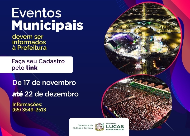 A Prefeitura de Lucas do Rio Verde deu início à organização do Calendário Oficial de Eventos 2026. Para evitar conflitos de datas entre ações municipais, privadas ou filantrópicas, os organizadores interessados devem realizar o cadastro das informações sobre seus eventos por meio de um formulário on-line, disponível no link forms.lucasdorioverde.mt.gov.br/portal/evento?id=5IUXDRM9ZCKF84LQ2EGH, entre os dias 17 de novembro e 22 de dezembro.