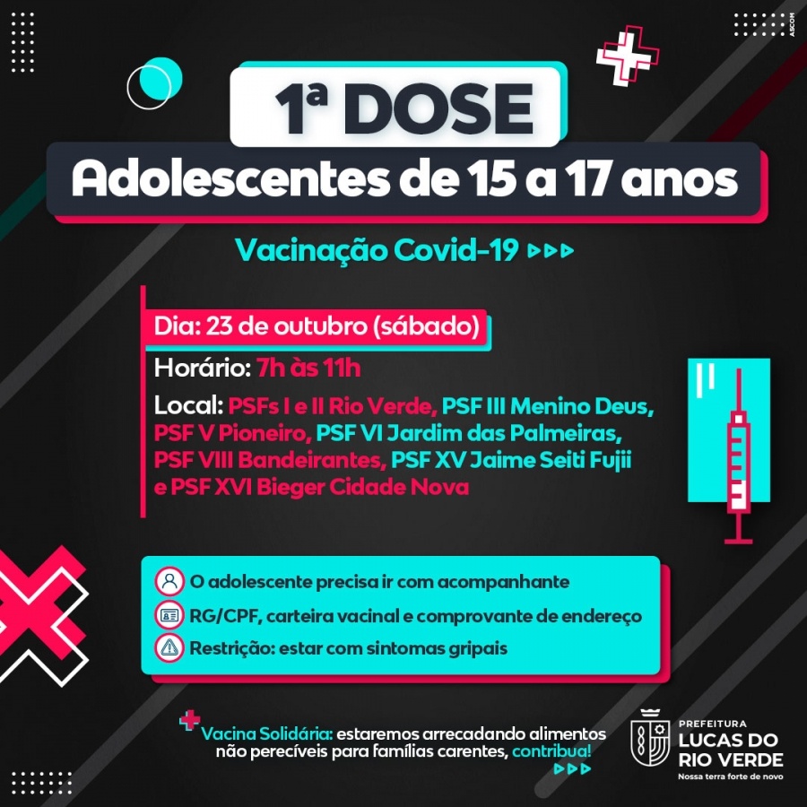 A Secretaria de Saúde de Lucas do Rio Verde convoca os ADOLESCENTES DE 15 A 17 ANOS (sem comorbidades) para receberem a primeira dose da vacina contra a Covid-19.