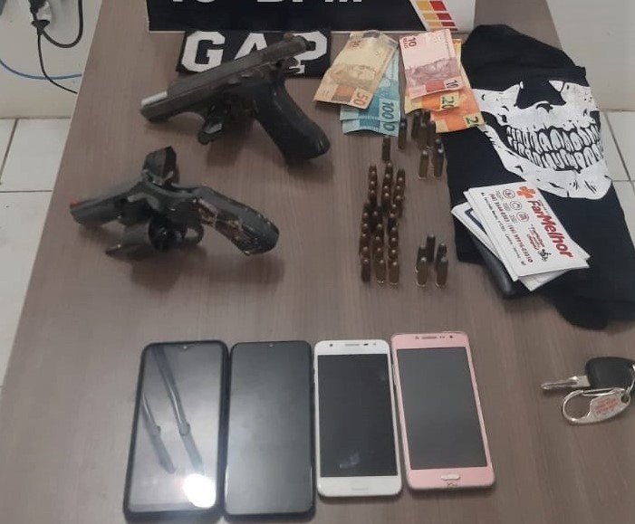 Na noite desta quinta-feira (13), uma guarnição da PM foi acionada sobre um veículo que estava com 4 pessoas em atitude suspeita. Os policiais fizeram a abordagem e encontraram com os suspeitos duas armas de fogo, sendo uma pistola 9mm e um revólver calibre 38, além de munições e um capuz.