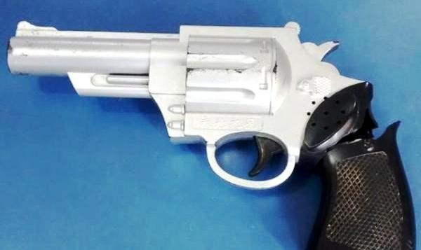 Eles acionaram a Polícia Militar que foi ao local e encontrou o suspeito. Na abordagem os militares encontraram na cintura do rapaz de 19 anos, um simulacro de arma de fogo tipo revólver.