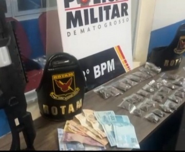 Durante revista no local, a polícia encontrou uma grande quantidade de entorpecentes, embaladas para venda, cerca de 611 reais em dinheiro trocado, além de uma arma de fogo de brinquedo.