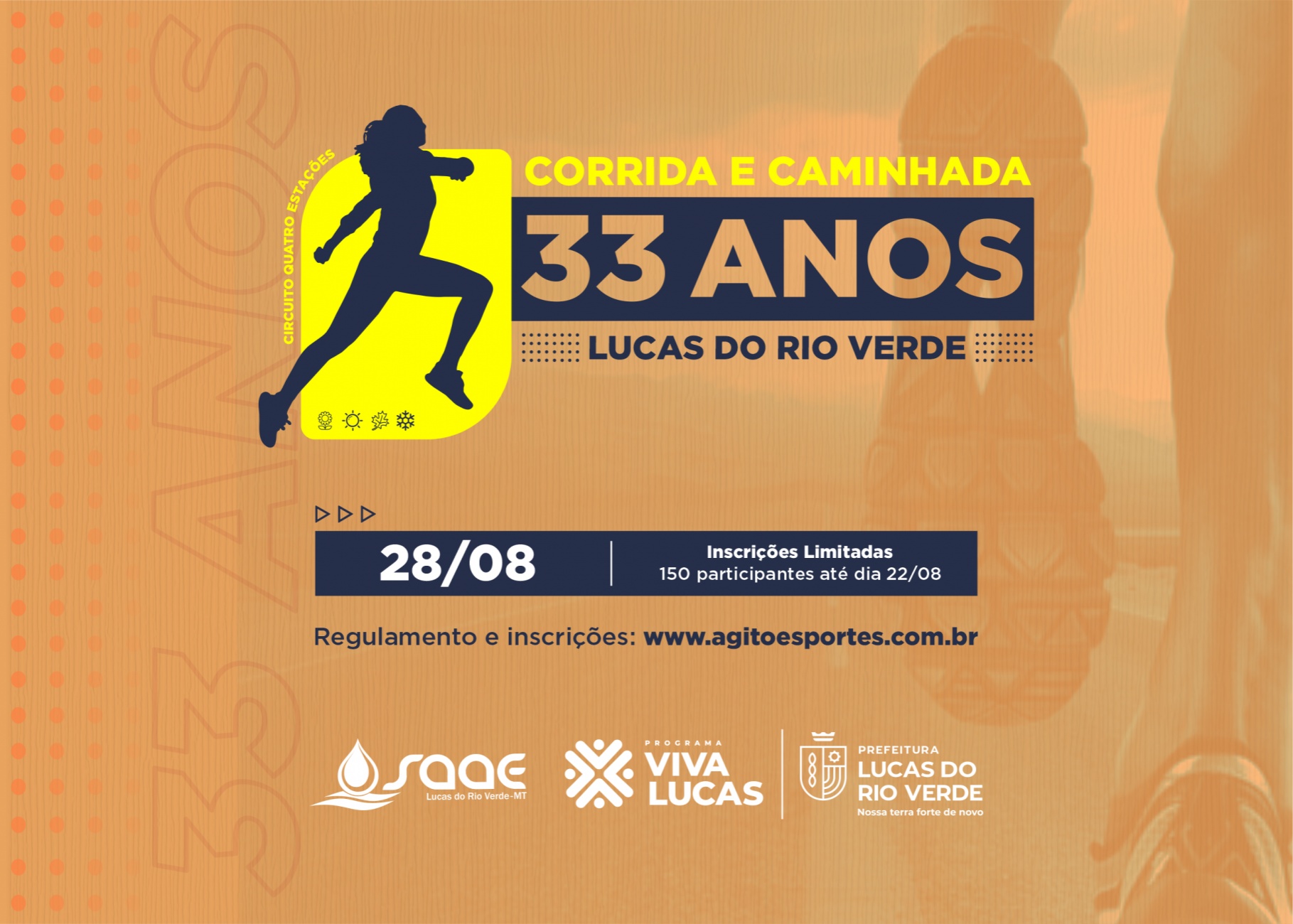 Dando sequência às ações de aniversário da cidade, a Prefeitura, por meio da Secretaria de Esporte e Lazer, anunciou a realização da Corrida e Caminhada Lucas do Rio Verde 33 anos. As inscrições podem ser feitas a partir desta quarta-feira (11) até o dia 22 de agosto ou até atingir o número máximo de atletas que é 150.