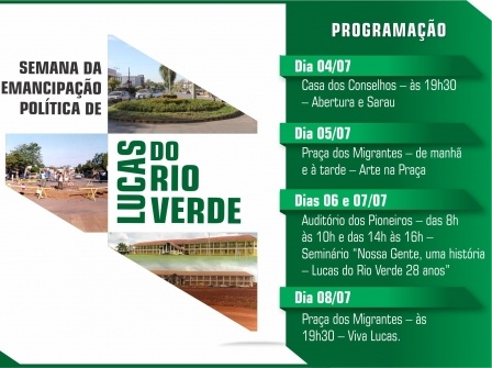 Para comemorar o aniversário de 28 anos de emancipação de Lucas do Rio Verde, celebrado em 4 de julho, a Prefeitura de Lucas do Rio Verde está preparando uma programação especial durante toda a semana.
