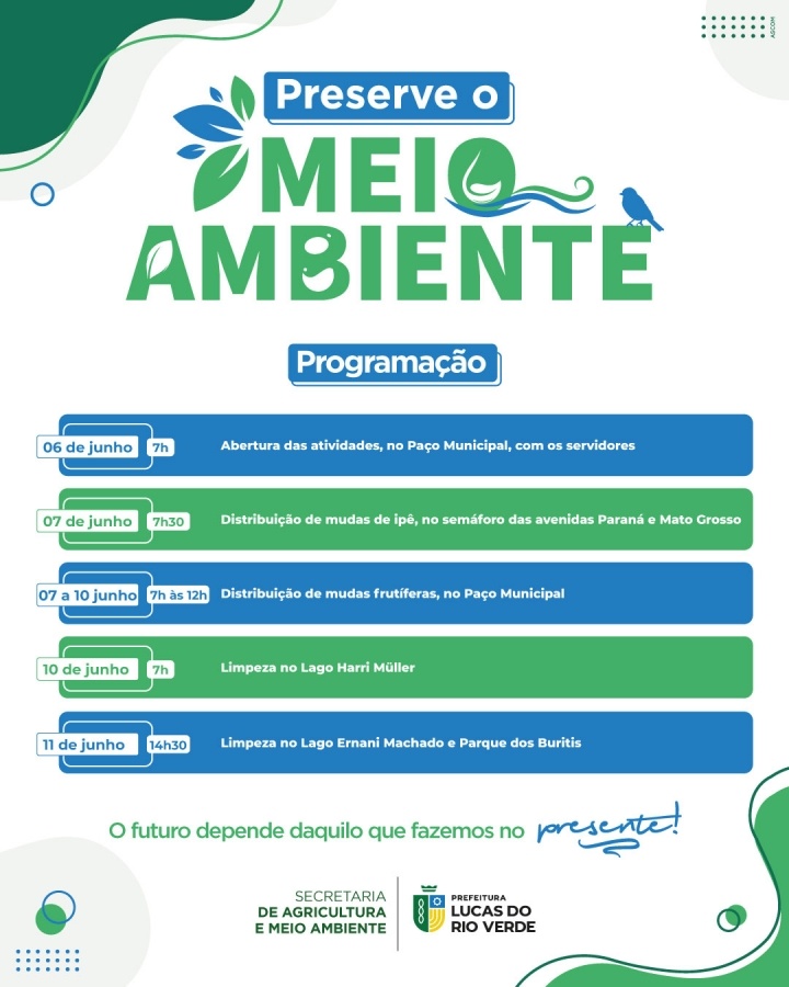 Com o tema “O futuro depende daquilo que fazemos no presente”, a Prefeitura de Lucas do Rio Verde, por meio da Secretaria de Agricultura e Meio Ambiente, está organizando atividades especiais para a Semana do Meio Ambiente.