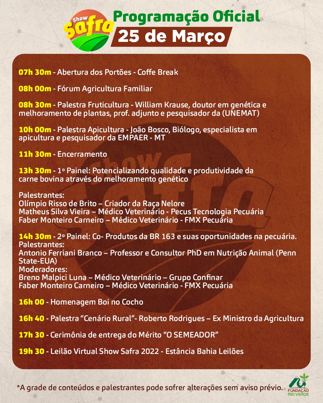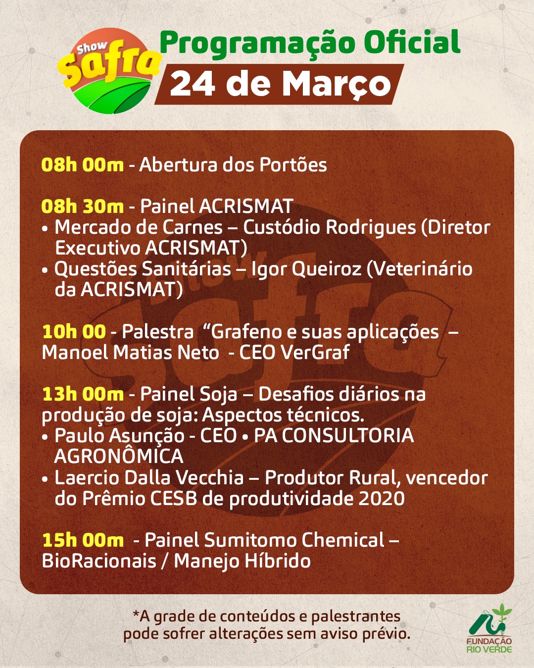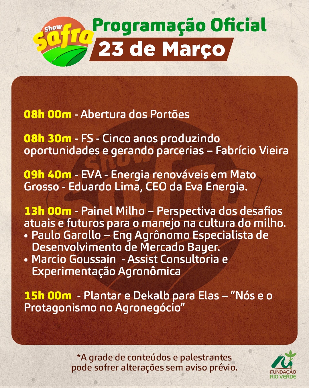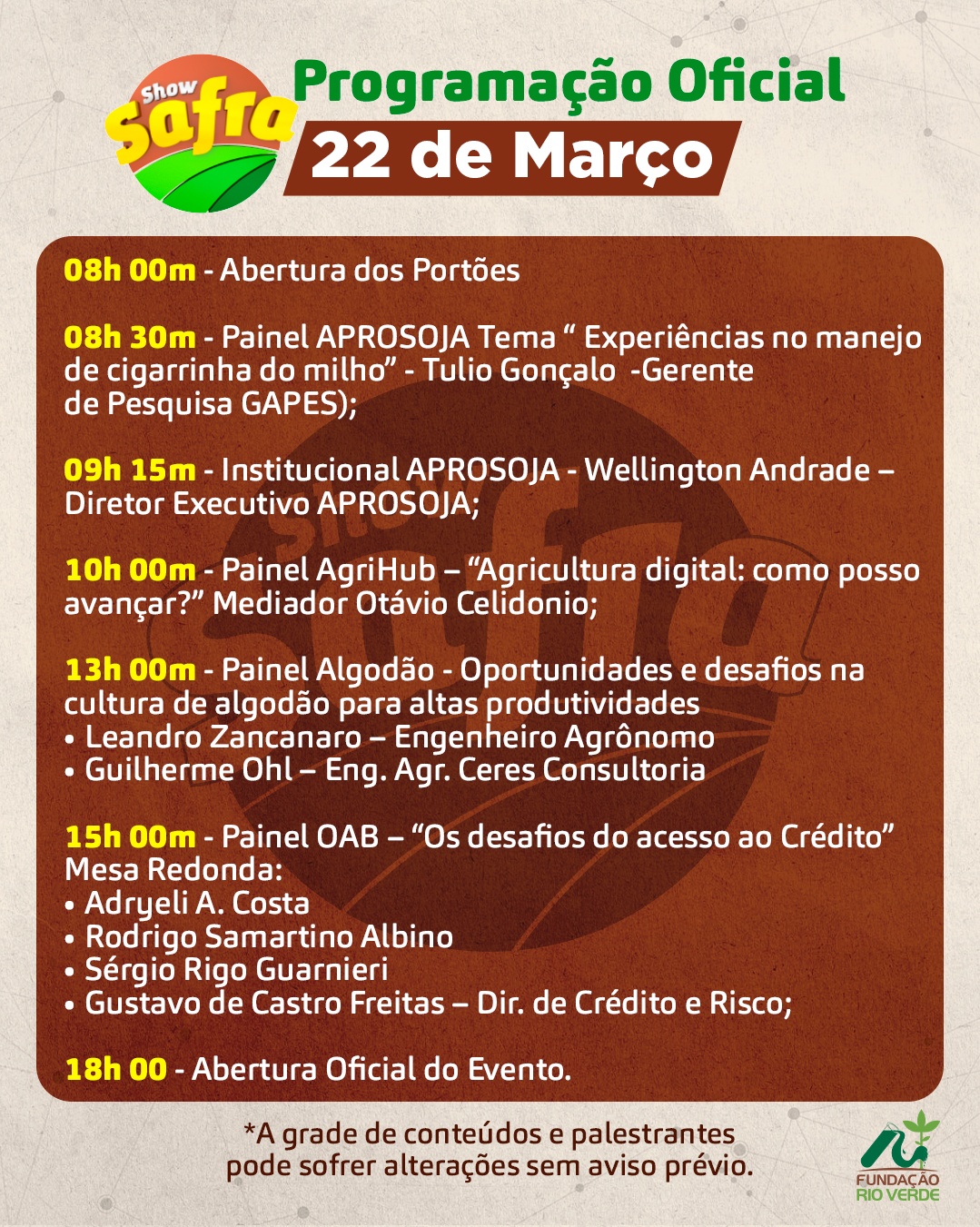 Veja abaixo a programação completa de todos os dias, marque seu horário e venha participar do maior Show Safra de todos os tempos: