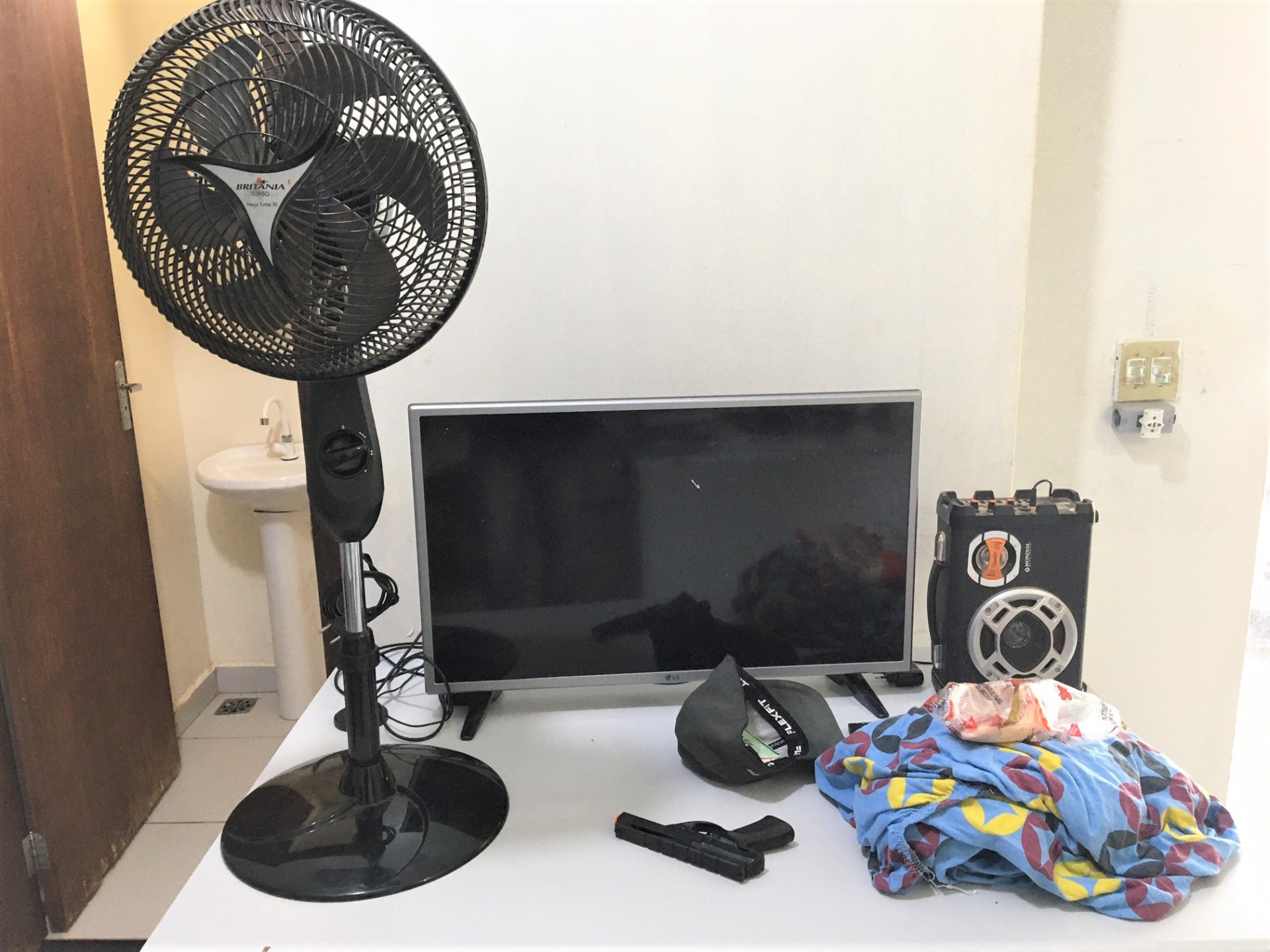 Os policiais então descobriram onde ele morava e lá encontraram os demais produtos de furto, dentre eles: aparelho de tv, caixa amplificadora, ventilador e até frango congelado que foi subtraído da geladeira da vítima.