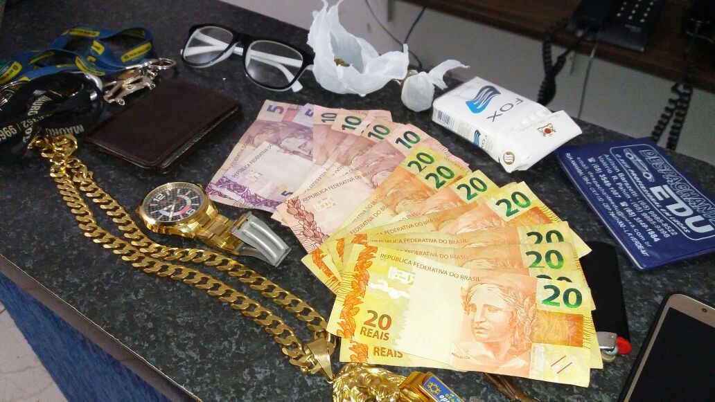 Com os conduzidos, os policiais localizaram: R$ 260,00 em dinheiro trocado; 12.4 gramas de substância análoga a maconha; um corrente de cor dourada; um relógio de cor dourada; óculos de cor branca com preto e uma carteira de cigarro.