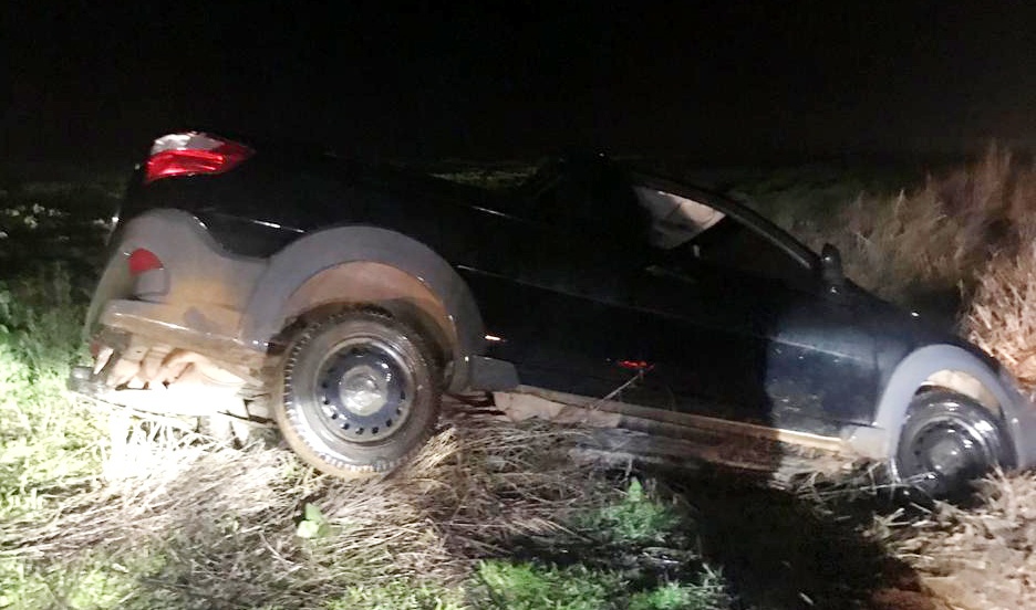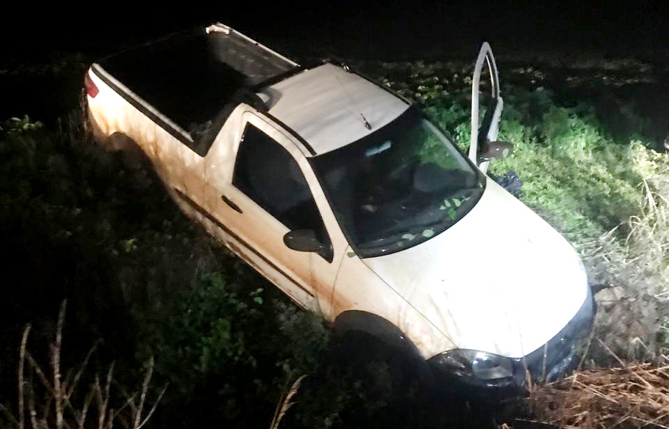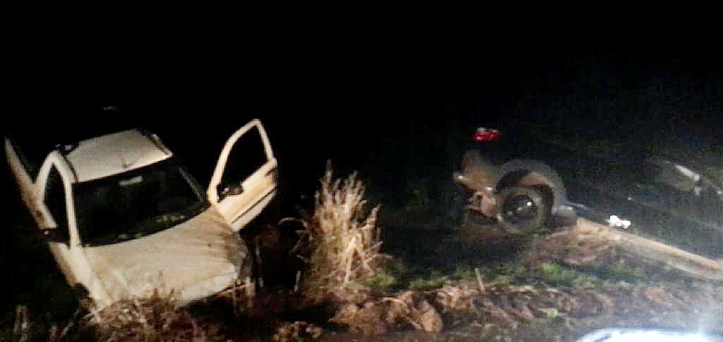 Os bandidos entraram em uma lavoura de soja, se perderam no local e caíram com os dois veículos em uma valeta e fugiram a pé pela lavoura. As pick ups foram checadas e não constam irregularidades. Eles permanecem no local.