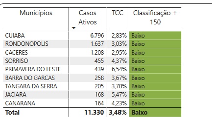 A Secretaria Estadual de Saúde (SES-MT) divulgou nesta segunda-feira (28.09) o Boletim Informativo n° 204 com o panorama da situação epidemiológica da Covid-19 em Mato Grosso. O documento mostra (a partir da página 11) que todos os 141 municípios do Estado configuram na classificação com risco baixo para o novo coronavírus.