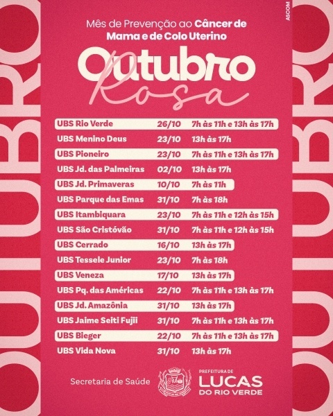 Durante o mês de outubro, a Prefeitura de Lucas do Rio Verde, por meio da Secretaria Municipal de Saúde, realiza uma programação especial voltada à prevenção e ao cuidado com a saúde da mulher.