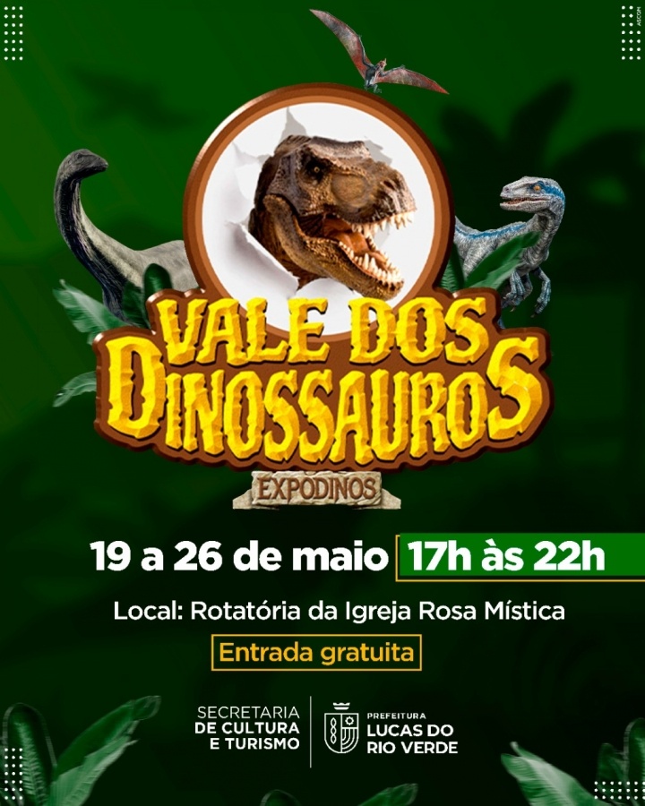 A rotatória da Rosa Mística em Lucas do Rio Verde voltará à pré-história a partir de hoje, 19 de maio, quando o local será transformado no Vale dos Dinossauros. A Expodinos, com entrada gratuita, traz réplicas animatrônicas de diferentes espécies de dinossauros. Até 26 de maio, das 17h às 22h, as famílias luverdenses poderão conferir de perto as feras da Era Mesozoica.